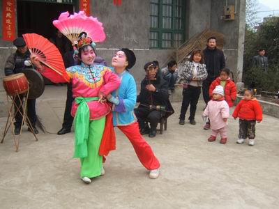 一旦一丑表演,用手巾和折扇作道具。旦的表演含蓄細(xì)膩,動(dòng)作優(yōu)美輕俏,以眉目傳情(脧眉眼)為特點(diǎn)。丑的表演活潑聰明,俏皮逗樂(lè),動(dòng)作粗獷。流傳在境內(nèi)的地花鼓有“洗菜心”、“銅錢歌”、“望郎歌”等。