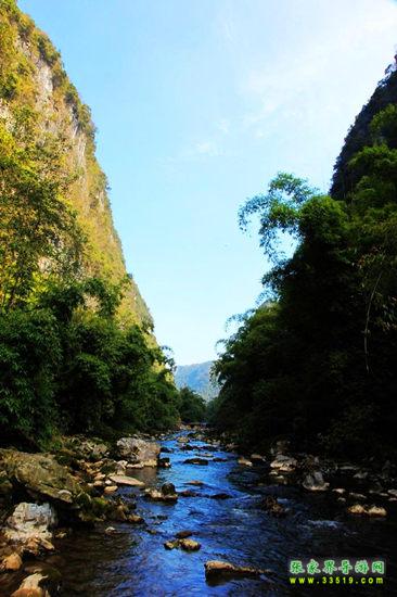 皮渡河沿岸修竹蒼翠,形成翠綠色的長廊,河水清澈透亮,象一條綠色鍛子串起無數(shù)明珠。峽谷中水與山親吻,形成靈動(dòng)的水韻與雄渾的山巒,構(gòu)成一幅山水長卷
