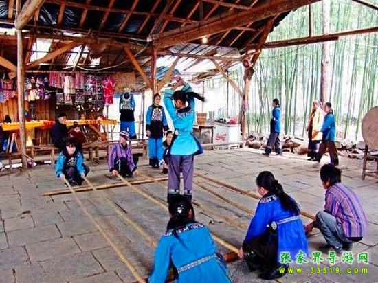 進入鳳凰香爐山苗寨必須過三道關:一是去剿匪,二是對山歌,三是喝三碗米酒。如果過不了這三道關,是不能進寨子的。剿匪就是過一道山洞(當年土匪躲藏的地方),也就是拍攝電影《湘西剿匪記》的現場,洞內驚險崎嶇,道路難走,還要過一條河,河面上的橋是用小木板釘成,僅一米寬,上面滴水,橋上很滑,橋下流水很急。