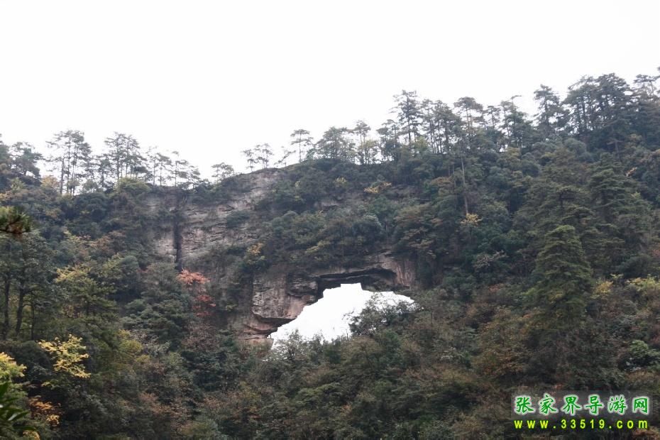 回音谷南向千米處,有一面綠叢如幔橫掛天宇的斜坡,坡上部一孔呈半月形洞開,似橋拱,長約40米,高20余米。拱上有一道約200米長的石梁形成橋面。此橋凌空飛架,兩端微翹,頂面寬4米,長滿青松灌木。登橋賞景,清風(fēng)拂面,薄霧繞膝,碧天遼闊,橋下幽谷中七八座青峰如小樹靜立足下,環(huán)顧四周,山巒奔踴,群峰翻騰。橋之西端巖峰凌空突出十幾米,似啄向天空的鷹嘴,鷹頭滿布常青灌木,如鷹毛茸茸。鷹顎頷為灰白色巖體。鷹之嘴尖上長一古松,飛出十多盤青枝。登鷹嘴撫松極目,山色盡覽。