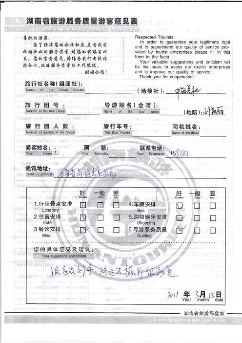 2011年3月15日王先生旅游服務(wù)質(zhì)量反饋:旅行很滿意