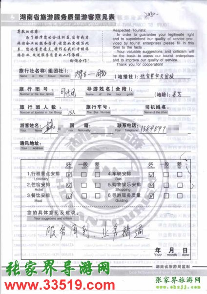 2010年7月14日韓先生一行15位旅游質(zhì)量反饋